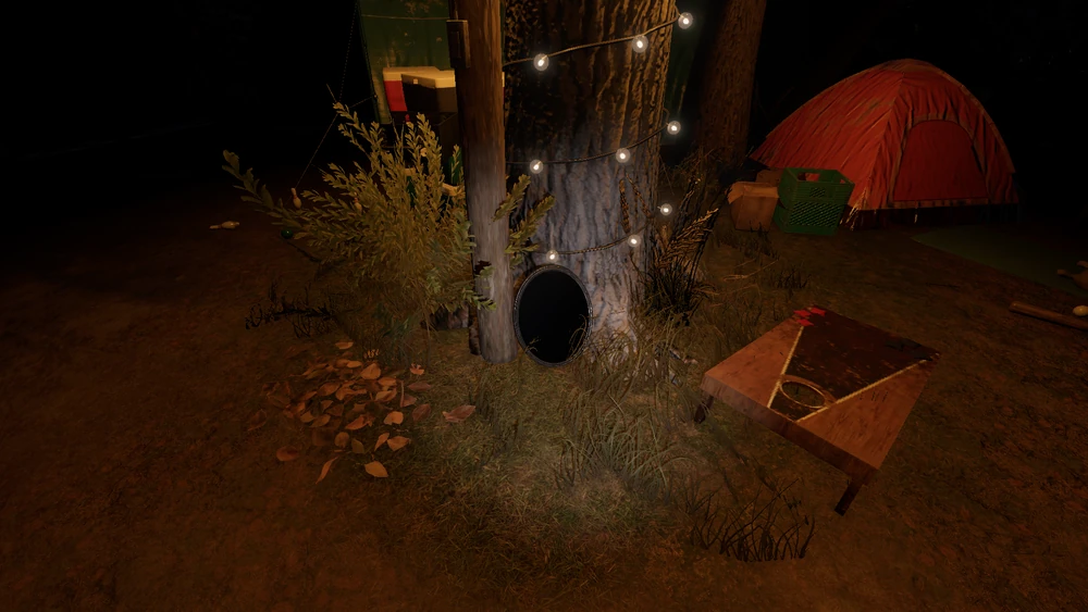 | Spiegel Der Spiegel erscheint an einem Baum mit Lichterketten in der Nähe des Lagerfeuers |