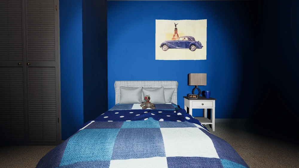 | Voodoo-Puppe Die Voodoo-Puppe erscheint auf dem Bett im großen blauen Schlafzimmer |