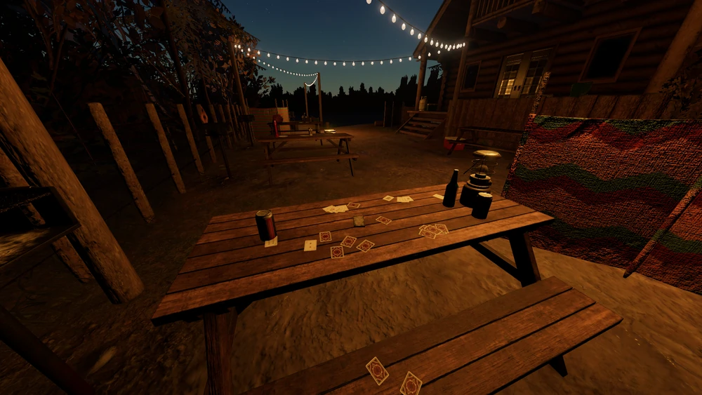 Die Tarotkarten erscheinen im Picknickbereich auf einem Tisch, der mit verstreuten Pokerkarten übersät ist