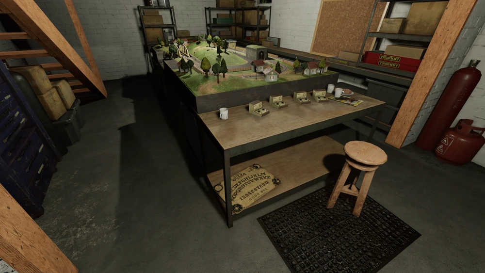| Ouija-Brett Das Ouija-Brett erscheint auf dem Eisenbahntisch im Keller |
